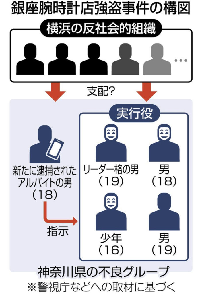 1: 蚤の市 ★ 2023/09/30(土) 06:55:56.05 ID:dWLriKZT9 東京・銀座の高級腕時計店で5月に起きた強盗事件で、実行役に犯行を指示したとして、警視庁少年事件課は29日、強盗と建造物侵入の疑いで、横浜市のアルバイトの男(18)を逮捕したと発表した。実行... -
