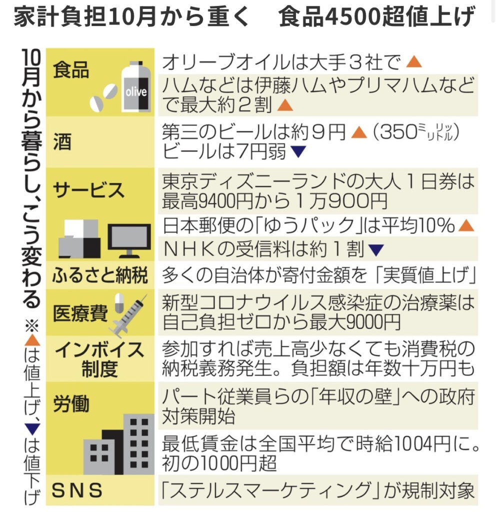 1: 蚤の市 ★ 2023/09/28(木) 21:52:25.74 ID:2KHsJskM9 家計の負担が10月から一段と重くなる。4500品目以上の食品が値上がりし、サービス価格も上がる。消費税を払ってこなかった個人事業主はインボイス(適格請求書)制度に参加すれば納税義務が生じる... -