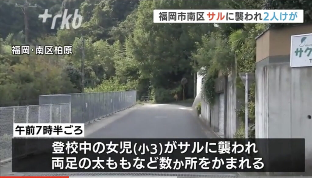 1: ちょる ★ 2023/09/28(木) 12:33:34.44 ID:??? TID:choru 28日午前、福岡市南区で登校中の女子児童と50代の女性がサルに足をかまれてけがをしました。現場周辺では、日頃からサルが目撃されていて警察が注意を呼びかけています。 RKB奥田千里「サ... -