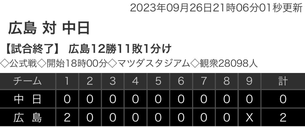 【野球】セ・リーグ C 2-0 D [9/26] 広島・床田8回途中無失点11勝目打者では3安打猛打賞、坂倉タイムリー2塁打 中日24度目完封負け