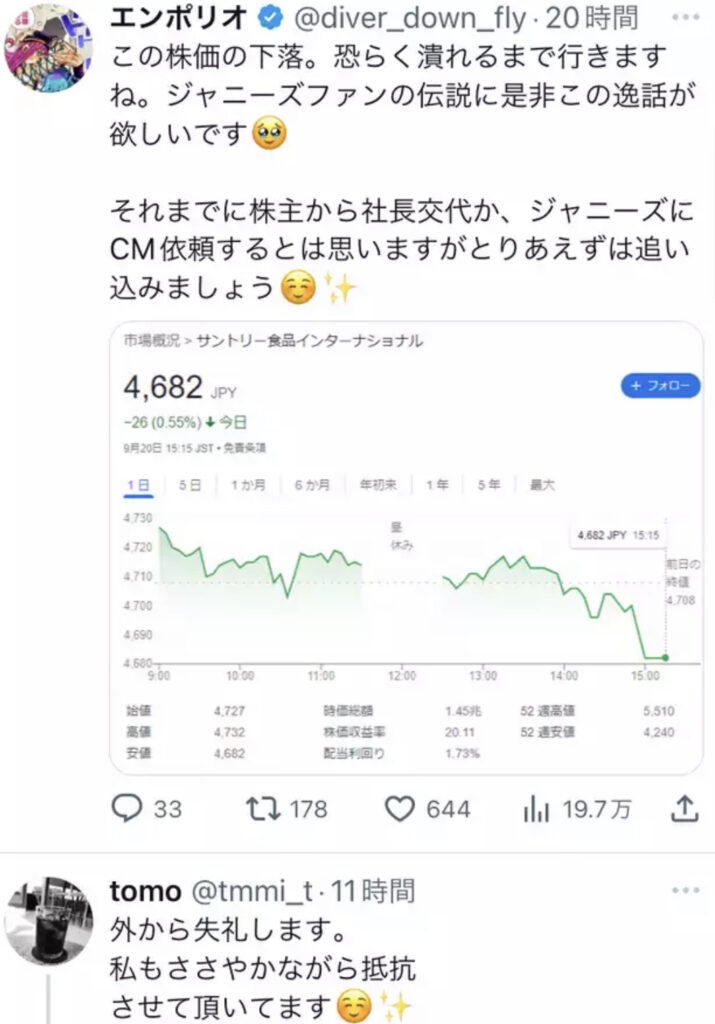 【悲報】ジャニオタ「私達の不買運動でサントリーに1日14億円の損失がでる」