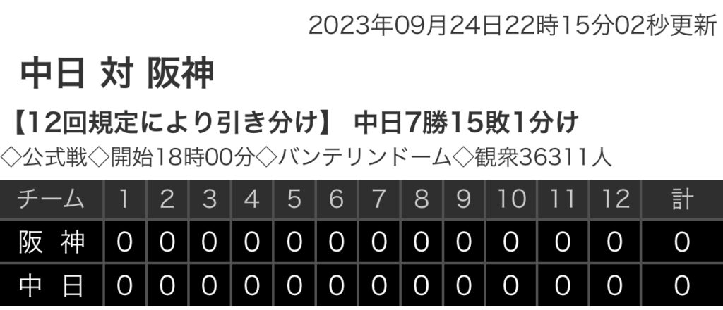 1: 鉄チーズ烏 ★ 2023/09/24(日) 22:13:28.39 ID:HBiDfmnF9 阪神 0 0 0 0 0 0 0 0 0 0 0 0|0 中日 0 0 0 0 0 0 0 0 0 0 0 0|0 【バッテリー】 (阪)才木、石井、ブルワー、桐敷 - 坂本 (中)柳、勝野、藤嶋、... -