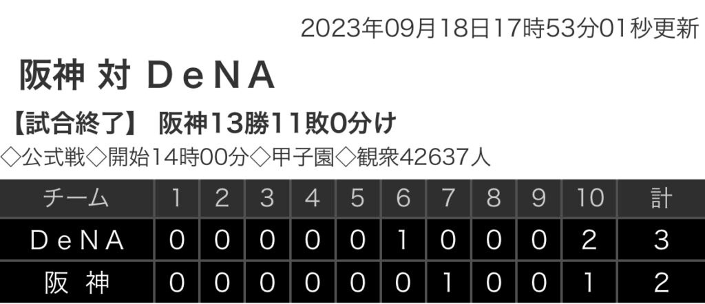 1: 鉄チーズ烏 ★ 2023/09/18(月) 17:44:42.71 ID:YVtMwDHv9 DeNA 0 0 0 0 0 1 0 0 0 2 |3 阪神 0 0 0 0 0 0 1 0 0 1 |2 【バッテリー】 (De)大貫、上茶谷、ウェンデルケン、エスコバー、伊勢、森原 - 伊... -