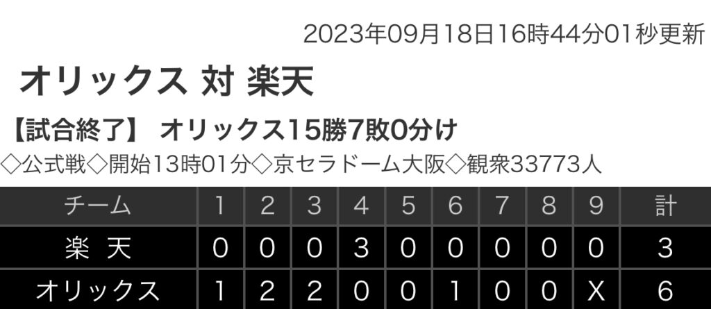 1: 鉄チーズ烏 ★ 2023/09/18(月) 16:43:41.72 ID:YVtMwDHv9 楽天 0 0 0 3 0 0 0 0 0|3 オリックス. 1 2 2 0 0 1 0 0 x|6 【バッテリー】 (楽)田中将、宮森、酒居、内、松井友 - 安田、太田 (オ)曽谷、山田、小... -