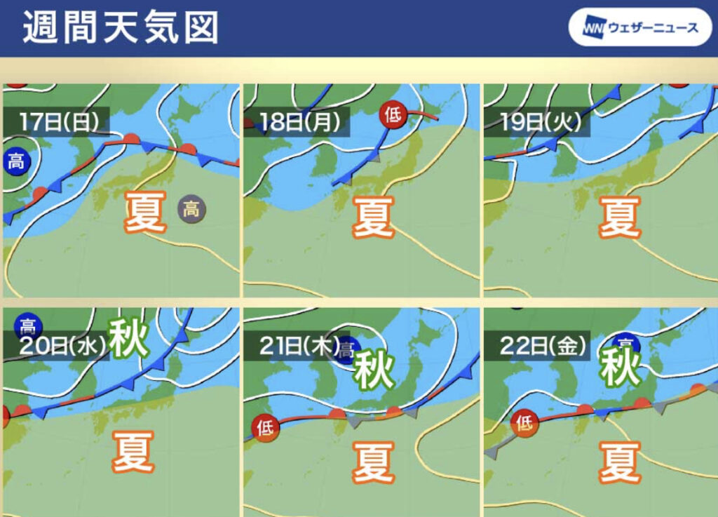 1: エンテカビル(東京都) [FR] 2023/09/18(月) 00:38:37.15 ID:xkFaokqG0● BE:421685208-2BP(4000) sssp://img.5ch.net/ico/syobo2.gif 遅れていた秋がようやく到来 20日(水)頃になると夏の高気圧が勢力を弱め、秋雨前線が日本海から本州南岸まで南下する... -