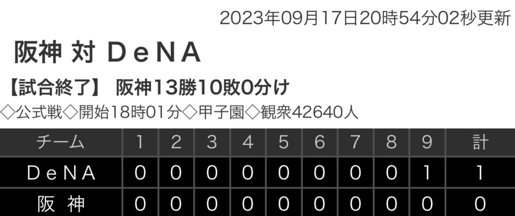1: 鉄チーズ烏 ★ 2023/09/17(日) 20:52:39.55 ID:DsXIBW3T9 DeNA 0 0 0 0 0 0 0 0 1 |1 阪神 0 0 0 0 0 0 0 0 0 |0 【バッテリー】 (De)濵口、上茶谷、ウェンデルケン、森原 - 山本 (阪) 村上、石井、桐敷、... -
