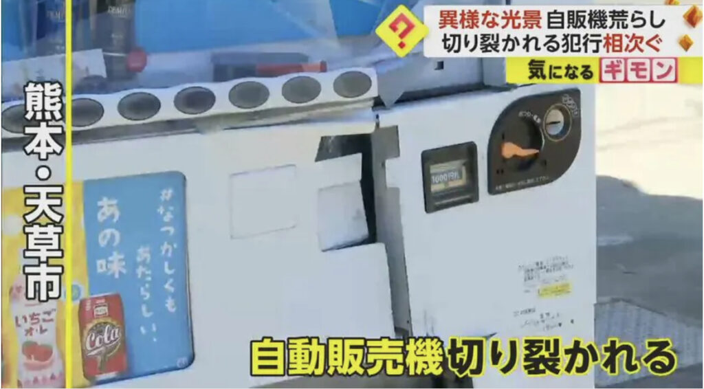 1: テイラー ★ 2023/09/17(日) 15:47:06.94 ID:??? TID:taylor 熊本・天草市にある自動販売機が、何者かによって切り裂かれる事件が起きた。7日、警察に寄せられた通報で発覚した。 さらに8月には、熊本・上天草市の2号橋公園でも、同様の事件が起きていた... -