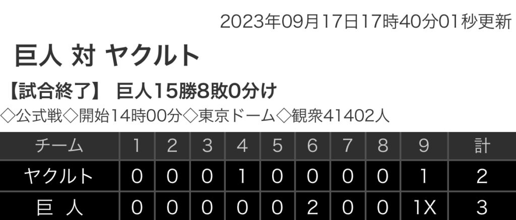 1: 鉄チーズ烏 ★ 2023/09/17(日) 17:29:07.87 ID:DsXIBW3T9 ヤクルト 0 0 0 1 0 0 0 0 1 |2 巨人 0 0 0 0 0 2 0 0 1x |3 【バッテリー】 (ヤ)小澤、石山、木澤、清水 - 中村 (巨)メンデス、船迫、中川、大勢 -... -
