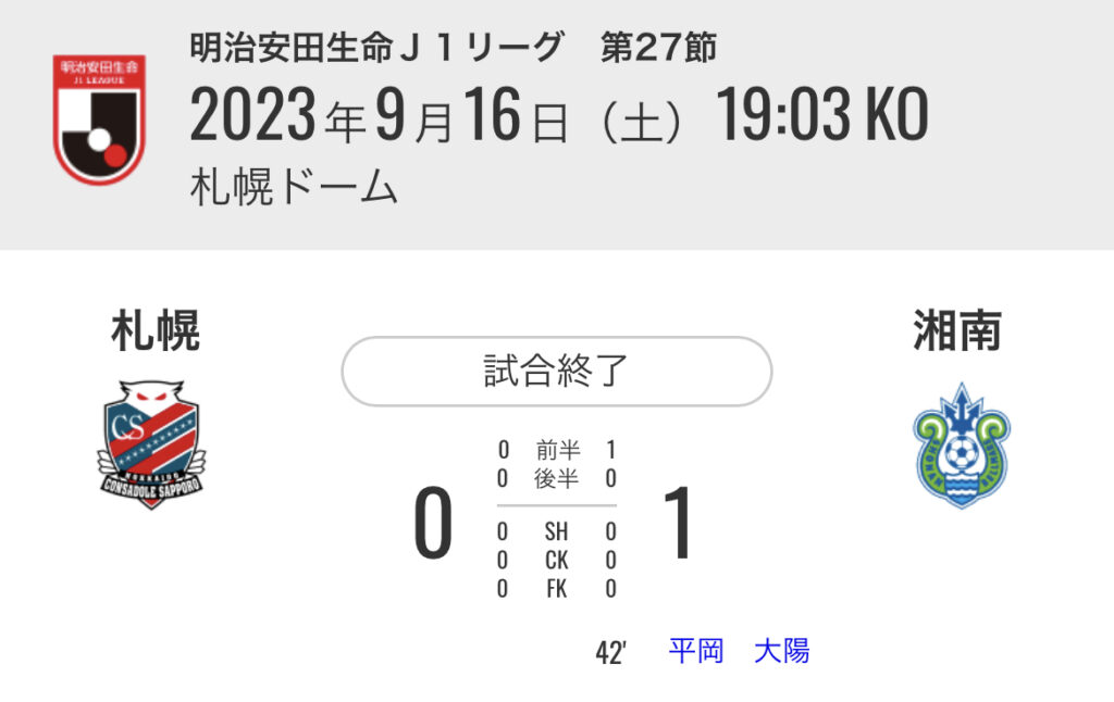 1: 久太郎 ★ 2023/09/16(土) 21:02:18.80 ID:X1CGHmqH9 札幌 0-1 湘南 [得点者] 42'平岡 大陽(湘南) スタジアム:札幌ドーム 入場者数:14,090人 https://www.jleague.jp/match/j1/2023/091601/live/#live 広島 2-0 神戸 [得点者] 07'志知 ...