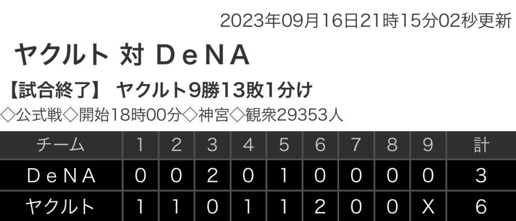 1: 鉄チーズ烏 ★ 2023/09/16(土) 21:09:08.06 ID:9P3SmlkI9 DeNA.. 0 0 2 0 1 0 0 0 0 |3 ヤクルト 1 1 0 1 1 2 0 0 x |6 【バッテリー】 (De)石田、上茶谷、山﨑、中川 - 山本 (ヤ) 小川、清水、星、田口 - ... -