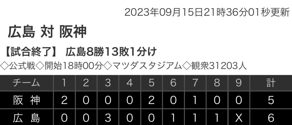 1: 鉄チーズ烏 ★ 2023/09/15(金) 21:35:25.32 ID:vT3WQ9gj9 阪神 2 0 0 0 2 0 1 0 0 |5 広島 0 0 3 0 0 1 1 1 x |6 【バッテリー】 (阪)及川、門別、浜地、加治屋 - 榮枝、長坂 (広)床田、矢崎、島内、栗林 - 坂倉 【... -