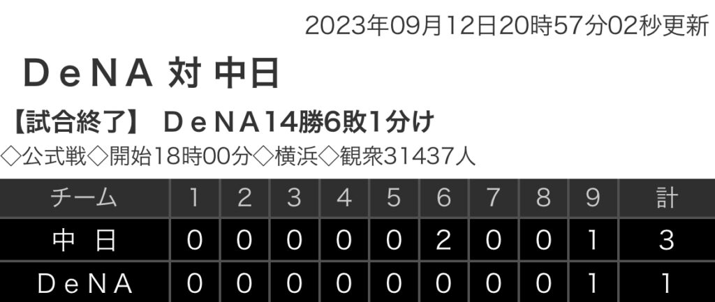 1: 鉄チーズ烏 ★ 2023/09/12(火) 20:47:38.47 ID:PNoWi1dK9 中日 0 0 0 0 0 2 0 0 1 |3 DeNA 0 0 0 0 0 0 0 0 1 |1 【バッテリー】 (中) 涌井、フェリス、松山、マルティネス - 木下 (De)大貫、山﨑、伊勢、... -