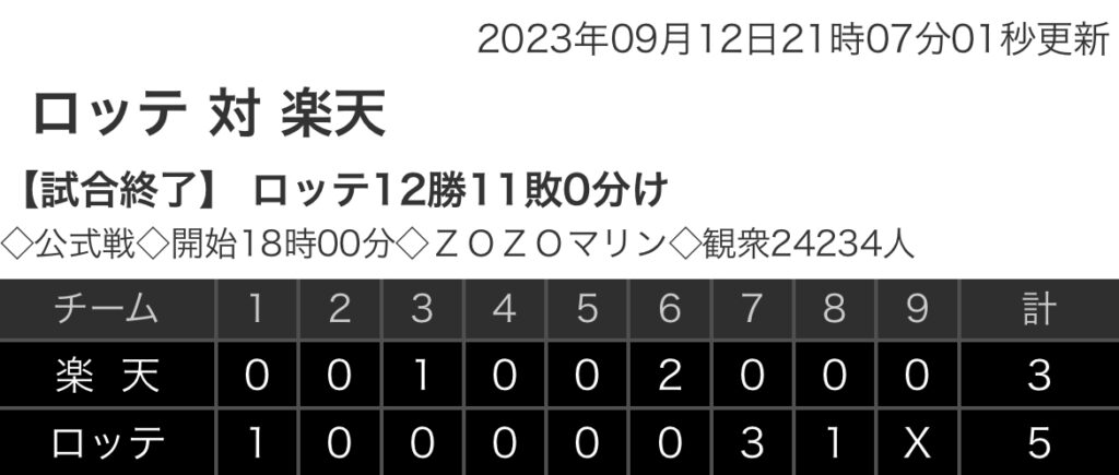 1: 鉄チーズ烏 ★ 2023/09/12(火) 21:06:31.32 ID:PNoWi1dK9 楽天. 0 0 1 0 0 2 0 0 0|3 ロッテ 1 0 0 0 0 0 3 1 x|5 【バッテリー】 (楽)則本、酒居 - 太田 (ロ)小島、澤田、ペルドモ、益田 - 佐藤都 【本塁打】 ... -