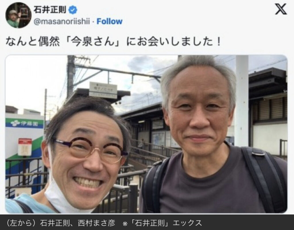 1: トトロ ★ 2023/09/12(火) 21:17:30.88 ID:??? TID:jiburi 俳優の石井正則が12日、自身のエックス(旧ツイッター)を更新。俳優の西村まさ彦との2ショットを公開すると、「古畑コンビですね~!!」と反響の声が上がった。 石井は「なんと偶然『今泉さん... -