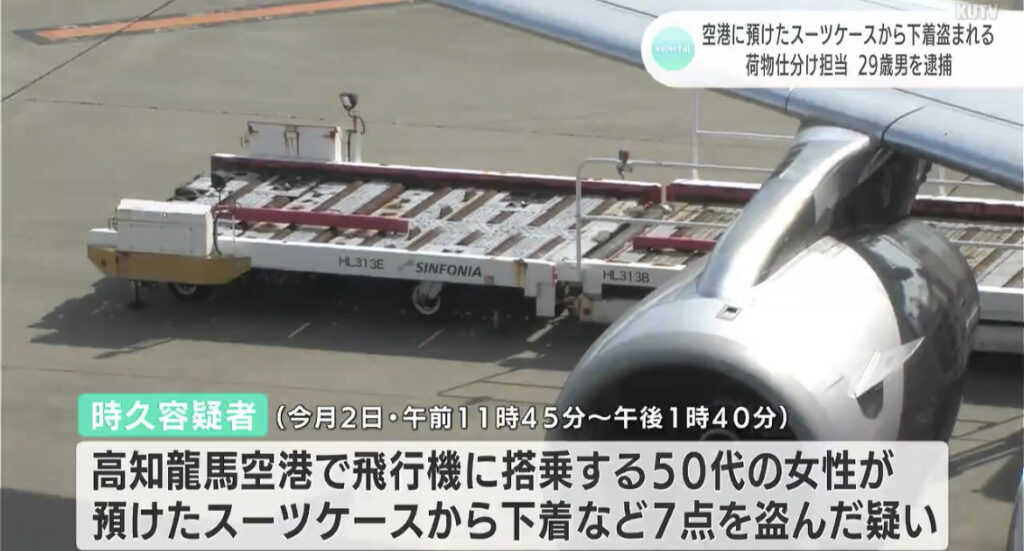 1: シャチ ★ 2023/09/12(火) 19:43:08.34 ID:/eneaVnC9 高知龍馬空港で飛行機の乗客が預けた荷物から下着などを盗んだ疑いで、荷物の仕分け作業を担当していた29歳の男が逮捕されました。航空会社にはこれまでにも「荷物から物が無くなった」という問い合... -