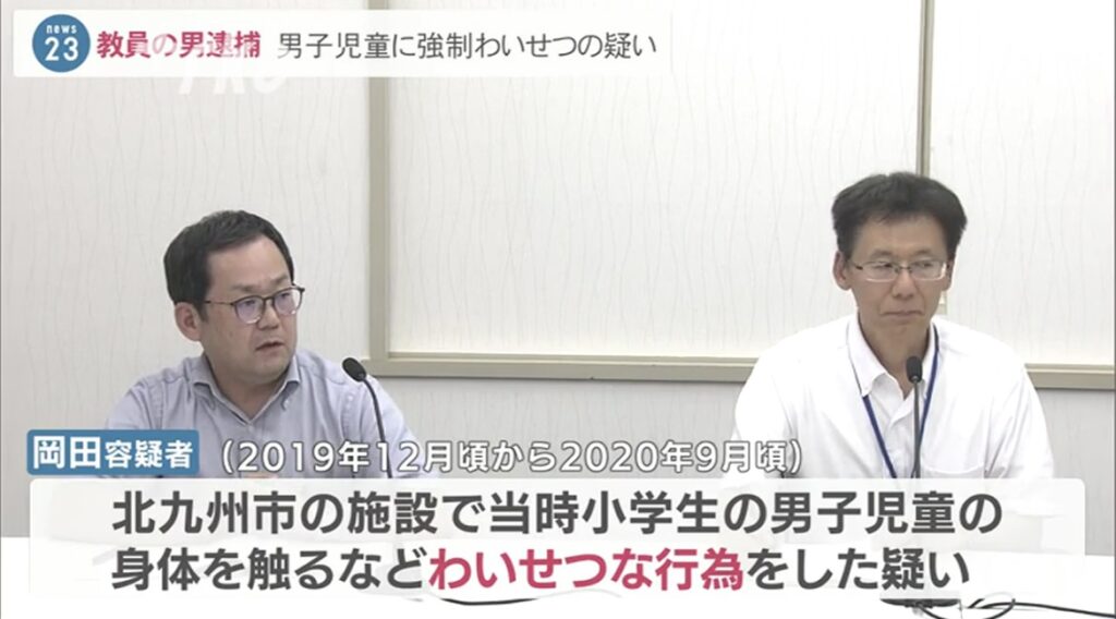 1: シャチ ★ 2023/09/12(火) 20:18:15.40 ID:/eneaVnC9 4年前に当時小学生の男子児童にわいせつな行為をしたとして、北九州市の小学校に勤める25歳の教員の男が逮捕されました。 強制わいせつの疑いで逮捕されたのは、北九州市の小学校に勤める教員・岡田... -
