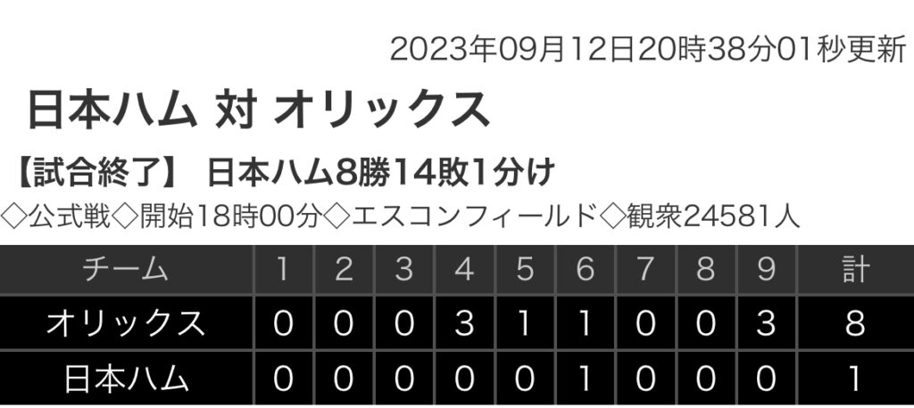 1: 鉄チーズ烏 ★ 2023/09/12(火) 20:36:54.82 ID:PNoWi1dK9 オリックス. 0 0 3 1 1 0 0 0 3|8 日本ハム 0 0 0 0 0 1 0 0 0|1 【バッテリー】 (オ)東、山田、山岡 - 若月 (日)ポンセ、山本拓、玉井、鈴木、石川 -... -