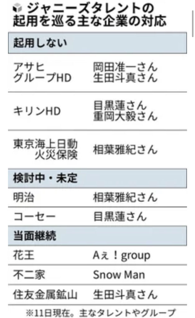 1: Ailuropoda melanoleuca ★ 2023/09/12(火) 16:30:35.29 ID:AlFpJzFx9 2023/09/12 16:16 花王は12日、ジャニーズ事務所の所属タレントを起用した広告の使用について、速やかに中止すると発表した。 CMのほか、ポスターや販促物などの展開も中止する... -