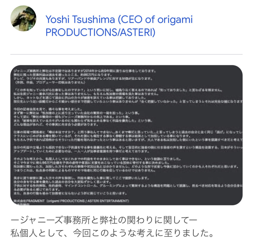 1: muffin ★ 2023/09/12(火) 16:59:46.27 ID:DgcGHN/f9 https://mdpr.jp/news/3946893 2023.09.12 16:40 音楽レーベル・origami PRODUCTIONS、ASTERI ENTERTAINMENTを運営する株式会社FRAGMENTのCEO・対馬芳昭氏が12日、ジャニーズ事務所の性加害問題につ... -