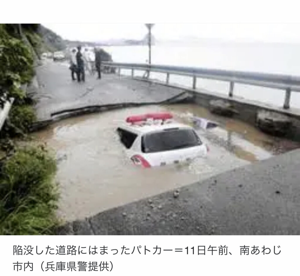 【兵庫・南あわじ】水がたまった巨大穴に軽自動車とパトカー転落、激しい雨で陥没か 運転の2人は窓から脱出