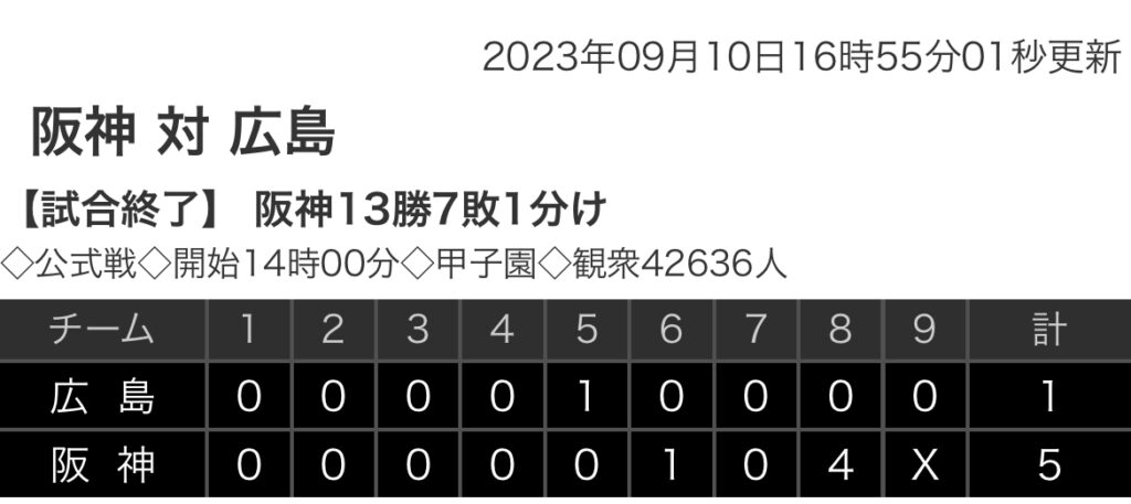 1: 鉄チーズ烏 ★ 2023/09/10(日) 16:55:07.21 ID:2+6JL2/S9 広島 0 0 0 0 1 0 0 0 0 |1 阪神 0 0 0 0 0 1 0 4 x |5 【バッテリー】 (広)九里、大道 - 會澤 (阪)伊藤将、岩貞 - 坂本 【本塁打】 (広)マクブルーム6号... -