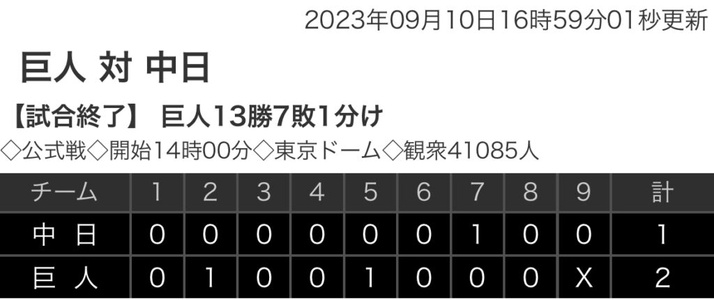 1: 鉄チーズ烏 ★ 2023/09/10(日) 17:00:21.90 ID:2+6JL2/S9 中日 0 0 0 0 0 0 1 0 0 |1 巨人 0 1 0 0 1 0 0 0 x |2 【バッテリー】 (中)柳、フェリス、松山 - 宇佐見 (巨)メンデス、松井、菊地、バルドナード、中川 ... -