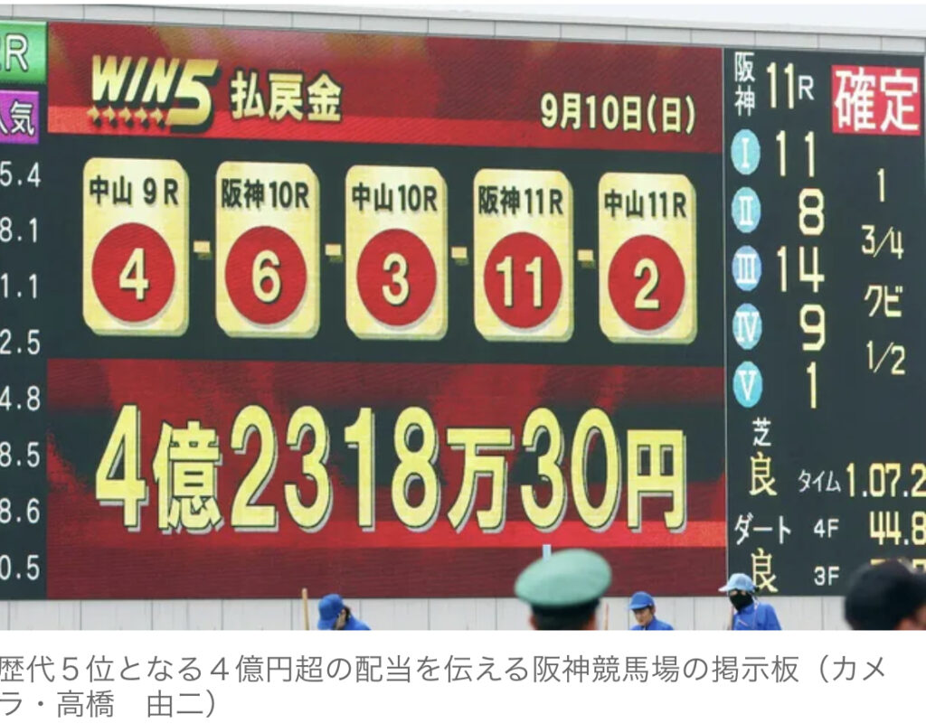 1: タロー ★ 2023/09/10(日) 16:41:17.84 ID:??? TID:taro JRAが発売した9月10日のWIN5で、歴代5番目の高額配当となる4億2318万30円の配当が飛び出した。的中はわずか1票。1億円超えは2023年7月23日の2億1884万7050... -