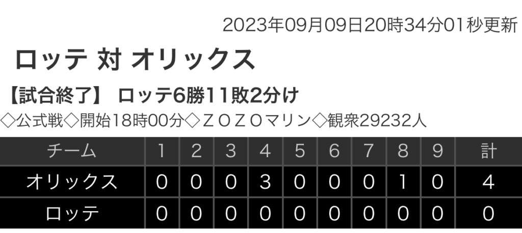 1: 鉄チーズ烏 ★ 2023/09/09(土) 20:23:38.07 ID:qm2qH/s89 オリックス 0 0 0 3 0 0 0 1 0|4 ロッテ 0 0 0 0 0 0 0 0 0|0 【バッテリー】 (オ)山本 - 若月 (ロ)美馬、東條、澤村 - 田村 【本塁打】 (オ) 杉本1...