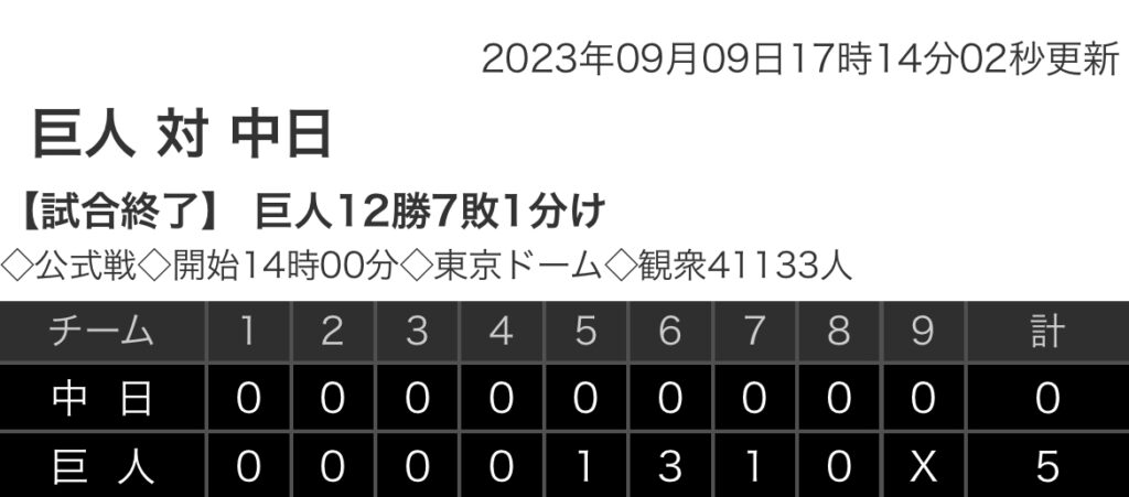 1: 鉄チーズ烏 ★ 2023/09/09(土) 17:12:30.19 ID:qm2qH/s89 中日 0 0 0 0 0 0 0 0 0 |0 巨人 0 0 0 0 1 3 1 0 x |5 【バッテリー】 (中)高橋宏、福、福谷、齋藤、祖父江 - 木下 (巨)菅野、船迫、菊地、バルドナード.... -