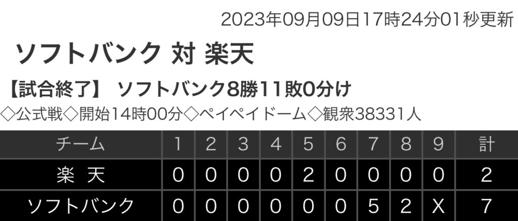 1: 鉄チーズ烏 ★ 2023/09/09(土) 17:22:19.71 ID:qm2qH/s89 楽天. 0 0 0 0 2 0 0 0 0|2 ソフトバンク 0 0 0 0 0 0 5 2 x|7 【バッテリー】 (楽)田中将、安樂、内 - 安田 (ソ)和田、又吉、甲斐野、藤井、松本... -