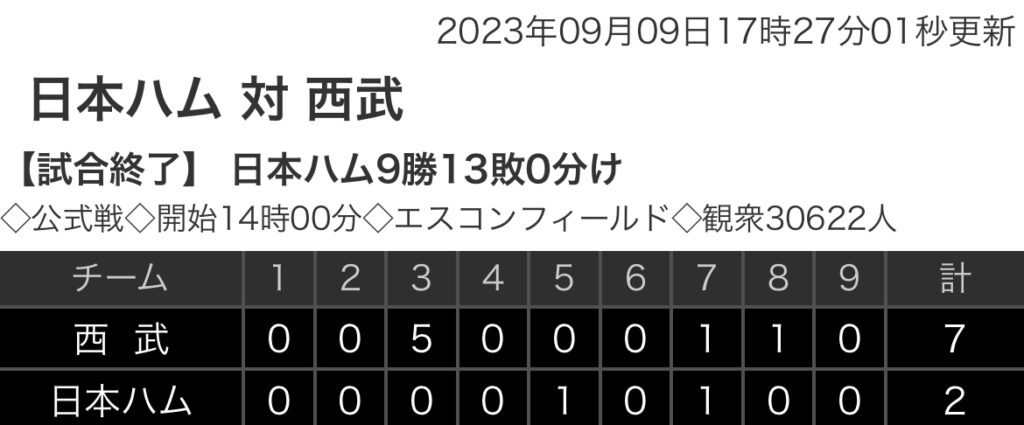 【野球】パ・リーグ F 2-7 L [9/9] 西武4連勝!古賀先制2号先制HR、中村16号3ラン、隅田6回1失点8勝目 日本ハム4連敗