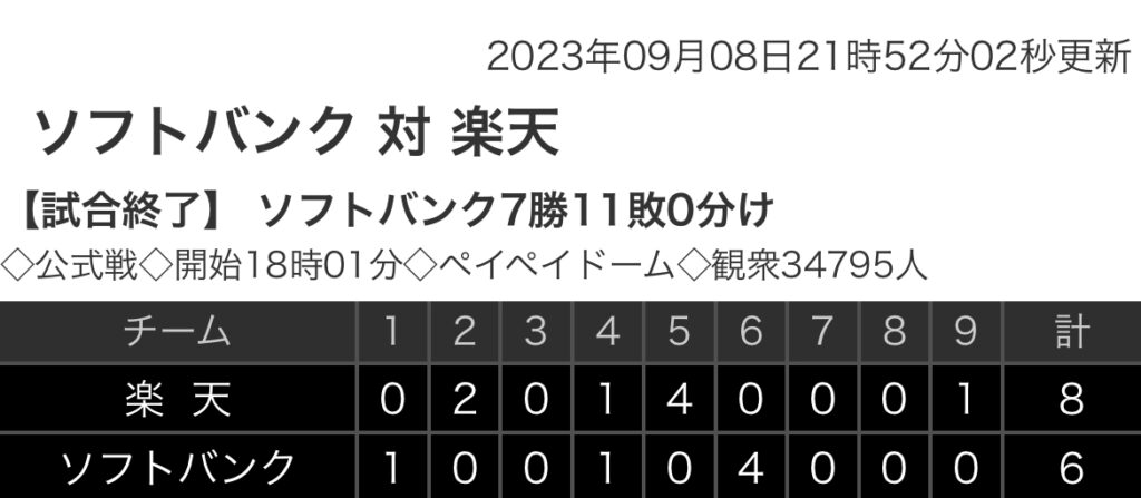 1: 鉄チーズ烏 ★ 2023/09/08(金) 21:51:57.78 ID:OpNcV3p59 楽天. 0 2 0 1 4 0 0 0 1|8 ソフトバンク 1 0 0 1 0 4 0 0 0|6 【バッテリー】 (楽)岸、鈴木翔、渡辺翔、松井裕 - 炭谷、太田 (ソ)石川、田浦、武... -