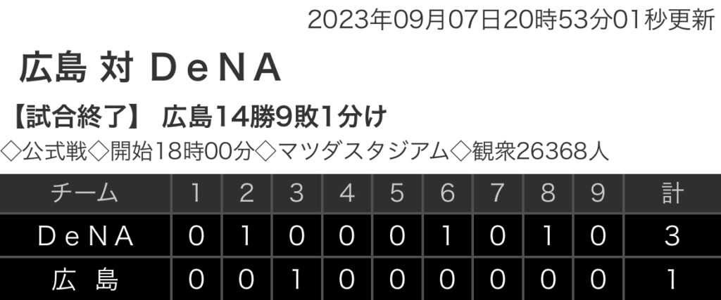 【野球】セ・リーグ C 1-3 DB [9/7] DeNA連敗脱出 東1失点完投13勝目、桑原2発6号勝ち越しHR、7号HR 広島連勝ストップ