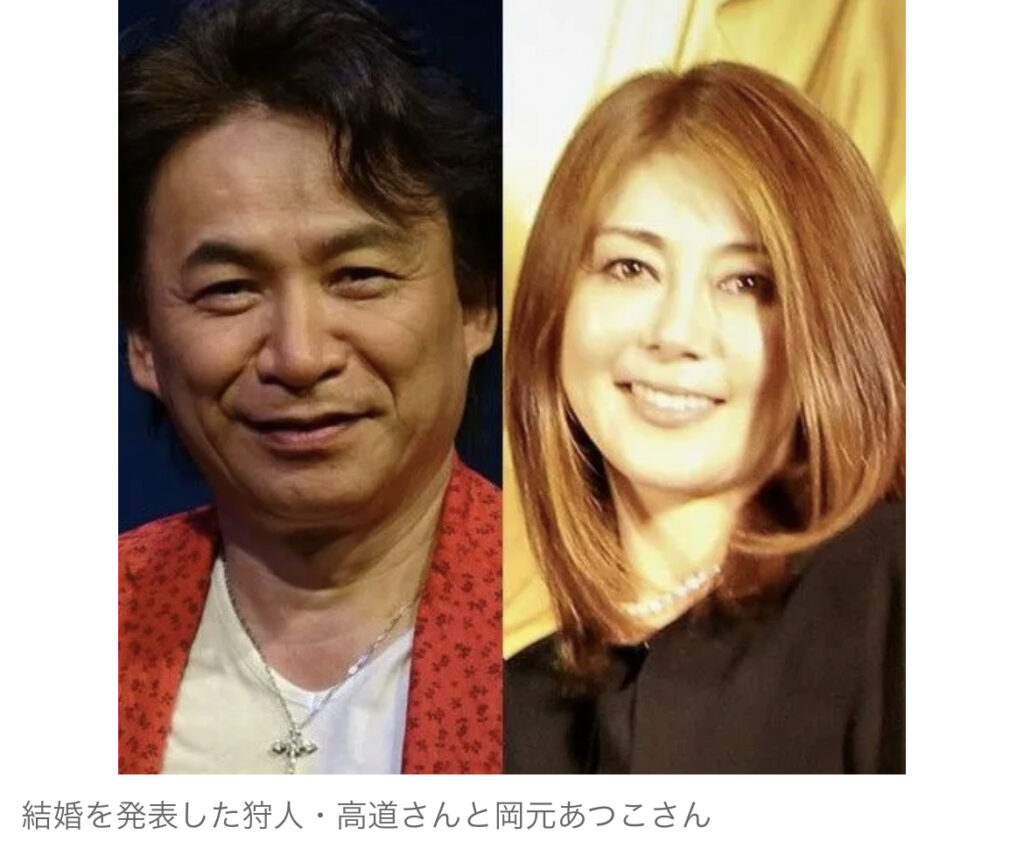 1: フォーエバー ★ 2023/09/07(木) 17:12:20.66 ID:IdRM/fs19 9/7(木) 13:10配信 日テレNEWS 結婚を発表した狩人・高道さんと岡元あつこさん 『あずさ2号』のヒット曲で知られる、兄弟デュオ・狩人の高道さん(63)と、タレントで俳優の岡元あつこさん(49...