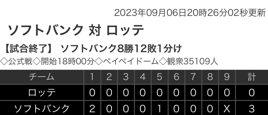 1: 鉄チーズ烏 ★ 2023/09/06(水) 20:25:06.47 ID:F+4Hai1u9 ロッテ 0 0 0 0 0 0 0 0 0|0 ソフトバンク 2 0 0 0 1 0 0 0 x|3 【バッテリー】 (ロ)西野、中村稔 - 田村 (ソ)有原、オスナ - 甲斐 【本塁打】 (... -