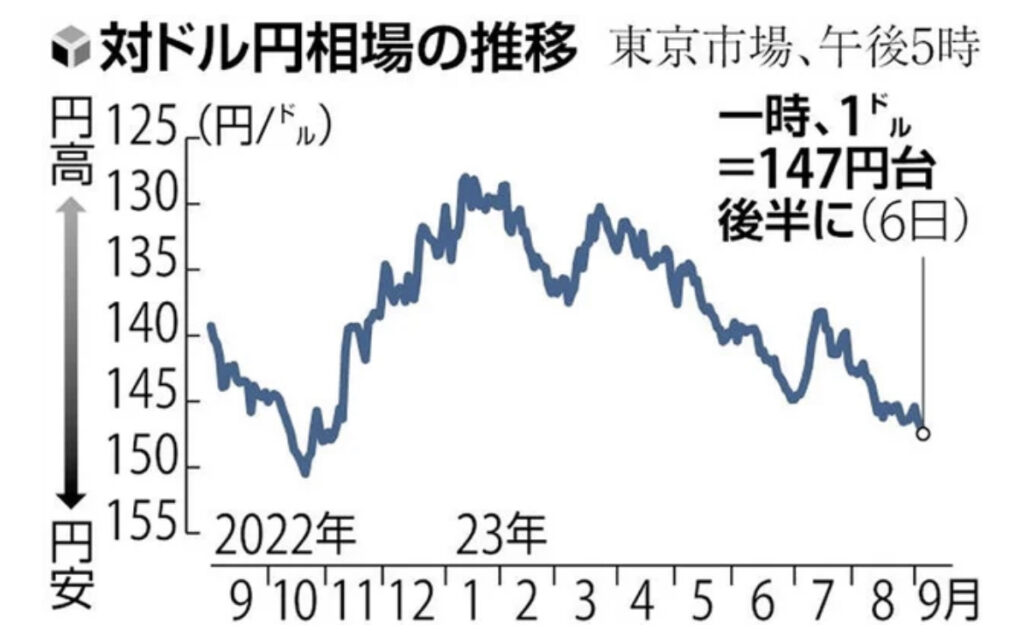 1: はな ★ 2023/09/06(水) 12:49:05.98 ID:PYnXMTy29 1ドル=147円80銭台、介入へ警戒感…10か月ぶりの円安水準 2023/09/06 12:24 読売新聞 https://www.yomiuri.co.jp/economy/20230906-OYT1T50161/ 6日の東京外国為替市場の円相場は、円売り・...