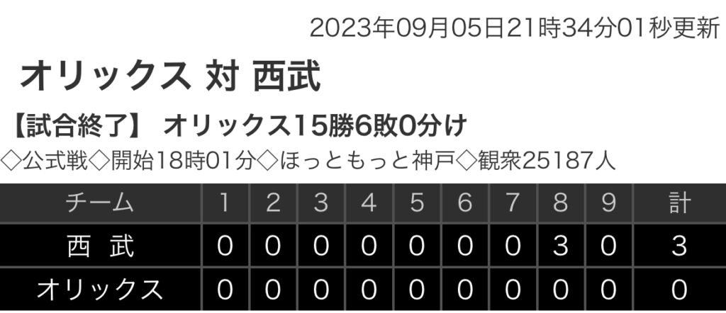 1: 鉄チーズ烏 ★ 2023/09/05(火) 21:29:04.76 ID:8VH7NbHu9 西武 0 0 0 0 0 0 0 3 0|3 オリックス. 0 0 0 0 0 0 0 0 0|0 【バッテリー】 (西)松本、田村、平井、クリスキー - 柘植、古賀 (オ)曽谷、山田、小木... -