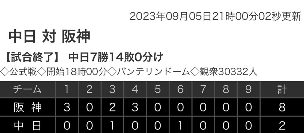 1: 鉄チーズ烏 ★ 2023/09/05(火) 21:00:05.36 ID:8VH7NbHu9 阪神 3 0 2 3 0 0 0 0 0 |8 中日 0 0 1 0 0 1 0 0 0 |2 【バッテリー】 (阪)西勇、浜地、ブルワー - 坂本 (中)涌井、上田、祖父江、清水、齋藤 - 宇佐見 【... -