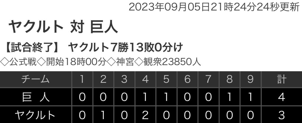 1: 鉄チーズ烏 ★ 2023/09/05(火) 21:22:58.68 ID:8VH7NbHu9 巨人 0 0 0 1 1 0 0 1 1 |4 ヤクルト 0 1 0 2 0 0 0 0 0 |3 【バッテリー】 (巨)山﨑伊、菊地、高梨、船迫、中川 - 大城卓 (ヤ)サイスニード、星、清水... -