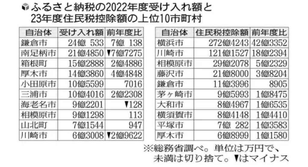 1: ぐれ ★ 2023/09/04(月) 00:26:56.73 ID:BDreAyb59 >>2023/09/03 09:53 読売新聞 神奈川県と県内33市町村で2023年度、ふるさと納税による寄付に伴う住民税の控除額(流出額)は過去最多の計707億5244万円に上ることが、総務省の調査... -