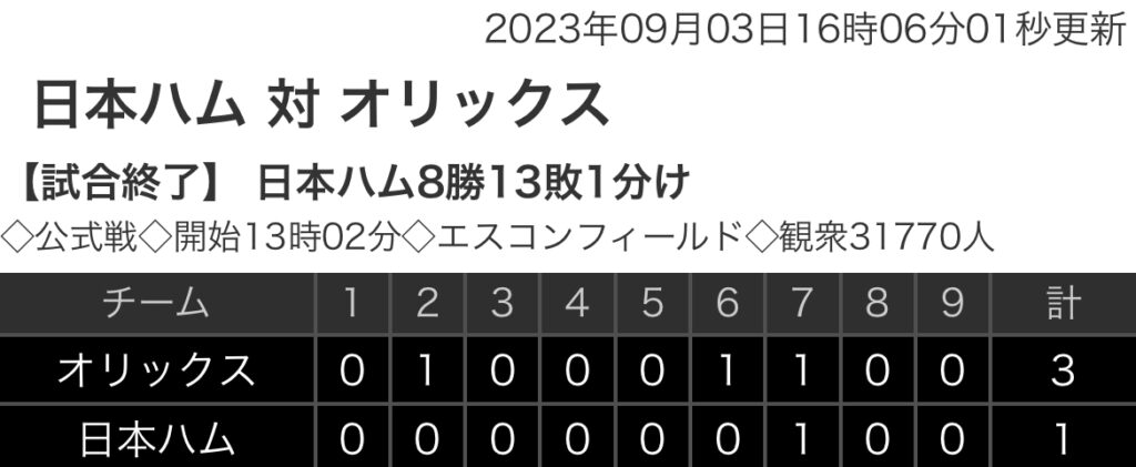 【野球】パ・リーグ F 1-3 B [9/3] オリックス連勝 佐野先制打&スクイズ、頓宮16号HR、東7回途中1失点4勝目 日本ハム連敗