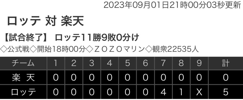 1: 鉄チーズ烏 ★ 2023/09/01(金) 20:58:33.99 ID:My4B7+Ac9 楽天. 0 0 0 0 0 0 0 0 0|0 ロッテ 0 0 0 0 0 0 4 1 x|5 【バッテリー】 (楽)岸、宋家豪、宮森 - 炭谷 (ロ)美馬、坂本、東條、岩下 - 田村 【本塁打】 ... -