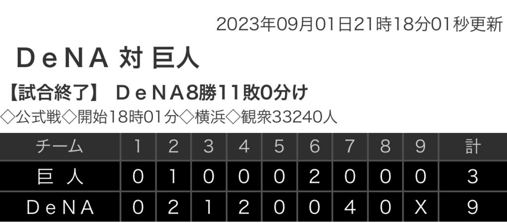1: 鉄チーズ烏 ★ 2023/09/01(金) 21:16:53.88 ID:My4B7+Ac9 巨人 0 1 0 0 0 2 0 0 0 |3 DeNA 0 2 1 2 0 0 4 0 0 |9 【バッテリー】 (巨) 戸郷、ビーディ、鈴木康、今村 - 岸田 (De)東、ウェンデルケン、エス... -