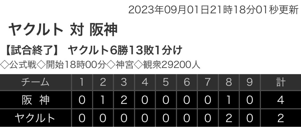 1: 鉄チーズ烏 ★ 2023/09/01(金) 21:19:27.16 ID:My4B7+Ac9 阪神 0 1 2 0 0 0 0 1 0 |4 ヤクルト 0 0 0 0 0 0 0 2 0 |2 【バッテリー】 (阪)村上、岩貞、桐敷、石井、岩崎 - 坂本 (ヤ)ロドリゲス、梅野、木澤 - ... -
