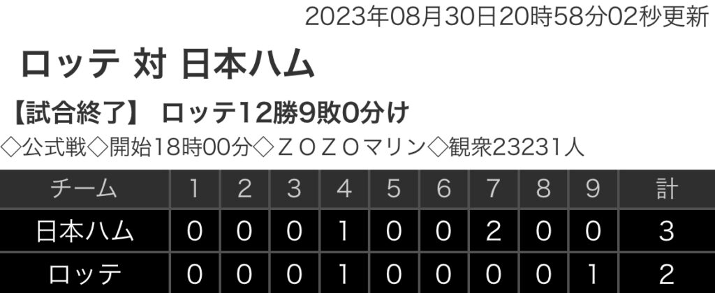 1: 鉄チーズ烏 ★ 2023/08/30(水) 20:56:25.34 ID:r8fI7FlN9 日本ハム 0 0 0 1 0 0 2 0 0|3 ロッテ. 0 0 0 1 0 0 0 0 1|2 【バッテリー】 (日)ポンセ、河野、池田、田中正 - 古川 (ロ)カスティーヨ、横山、鈴木 - ... -