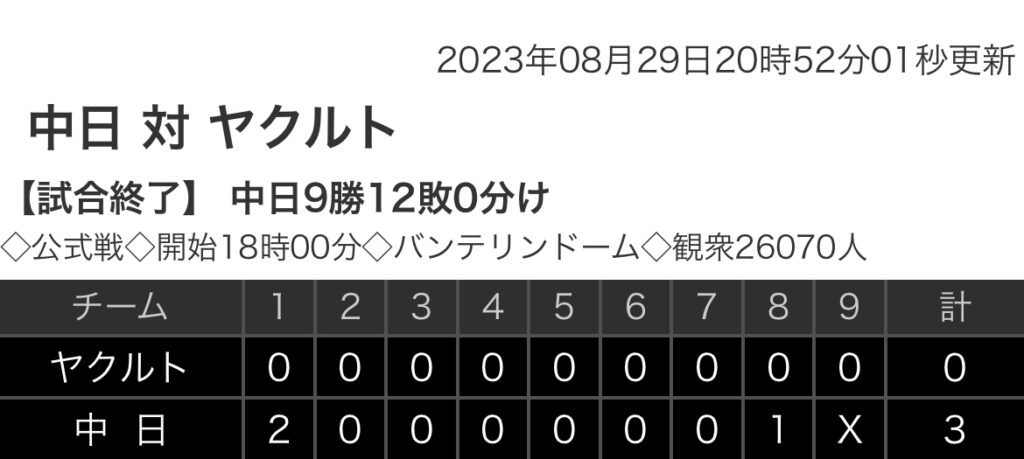 【野球】セ・リーグ D 3-2 S [8/30] 中日3連勝!小笠原7回途中2失点7勝目、宇佐見先制打、岡林・大島追加点 ヤクルト7連敗