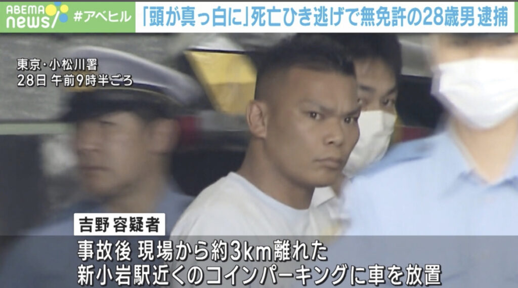 1: 樽悶 ★ 2023/08/28(月) 23:34:23.36 ID:uO4NdIHx9 吉野北斗容疑者(28) 無免許で車を運転して男性をはね、そのまま逃げて死亡させたとして、警視庁は住所不定、建築業の吉野北斗容疑者(28)を自動車運転死傷処罰法違反(無免許過失運転致死)と道路交... -