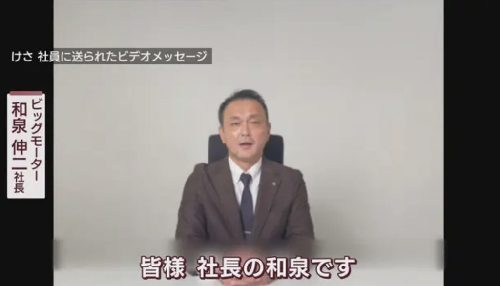 1: ばぐっち ★ 2023/08/26(土) 07:35:41.51 ID:??? TID:BUGTA ビッグモーター 和泉伸二社長:「皆様、社長の和泉です。日々猛暑が続くなかお客様へのご対応、誠にありがとうございます。またこのような状況においても、従業員の皆様に当社を支え続けてい... -