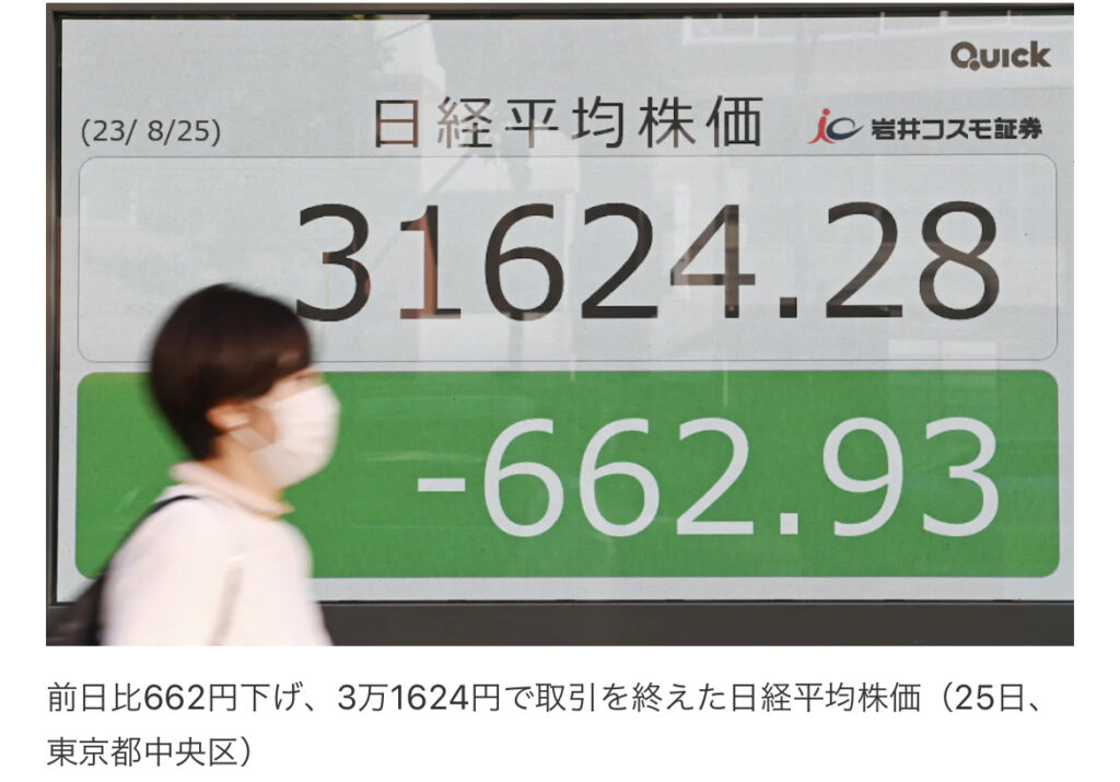 1: 蚤の市 ★ 2023/08/25(金) 17:34:53.02 ID:es7GZl2o9 25日の東京株式市場で日経平均株価は5営業日ぶりに大幅反落し、前日比662円93銭(2.05%)安の3万1624円28銭で終えた。下げ幅は今年2番目の大きさ。前日の米ハイテク株安を受け、運用リスクを回避する... -