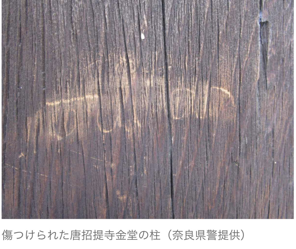 1: 煮卵▲ ★ 2023/08/25(金) 11:37:27.12 ID:/XDJiihi9 産経新聞 2023/8/24 18:24 https://www.sankei.com/article/20230824-LPESY4OABNP6TFZ4ZLIFULPMJQ/ 奈良市五条町の唐招提寺金堂(国宝)の柱に傷を付けたとして、奈良県警奈良署は24日、文化財保護... -
